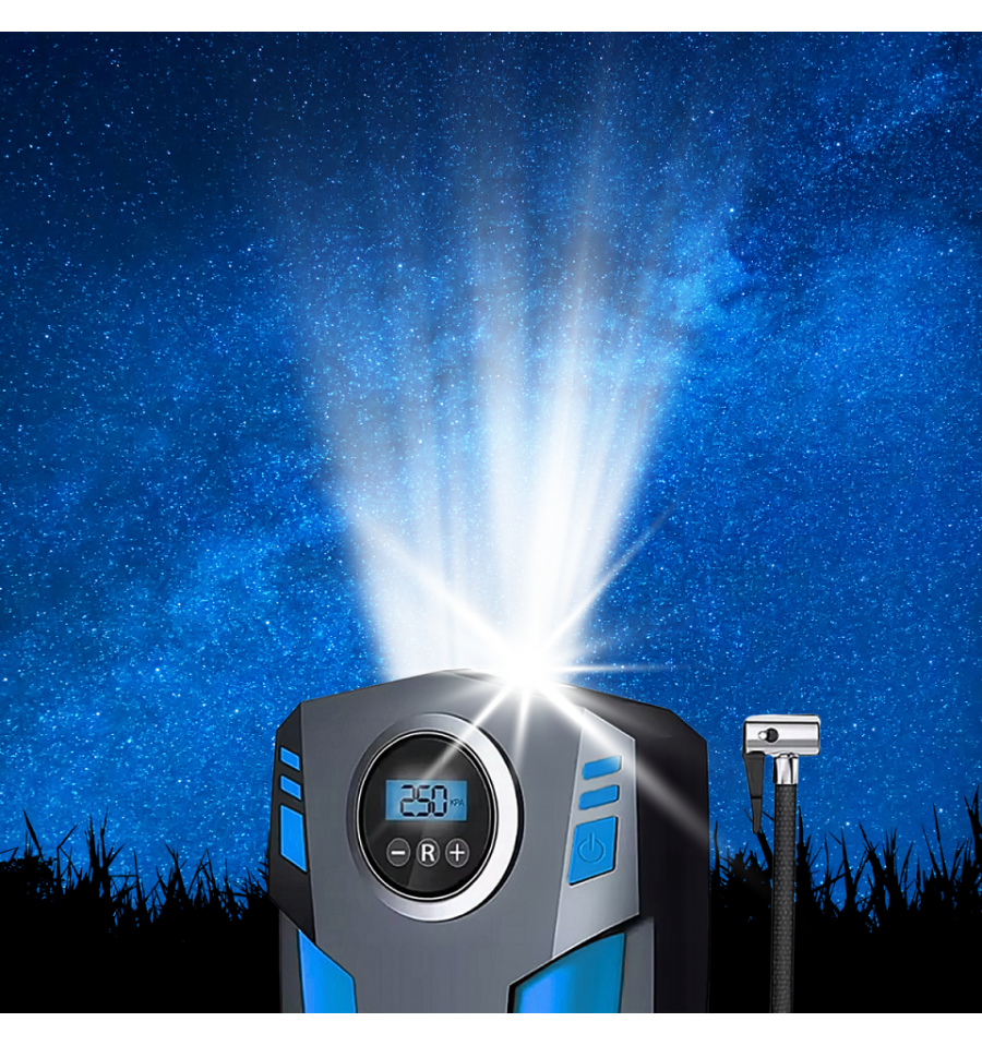 Wbudowana lampa LED ułatwia pracę po zmroku, a automatyczne wyłączanie po osiągnięciu zadanego ciśnienia gwarantuje bezpieczeństwo i komfort użytkowania.