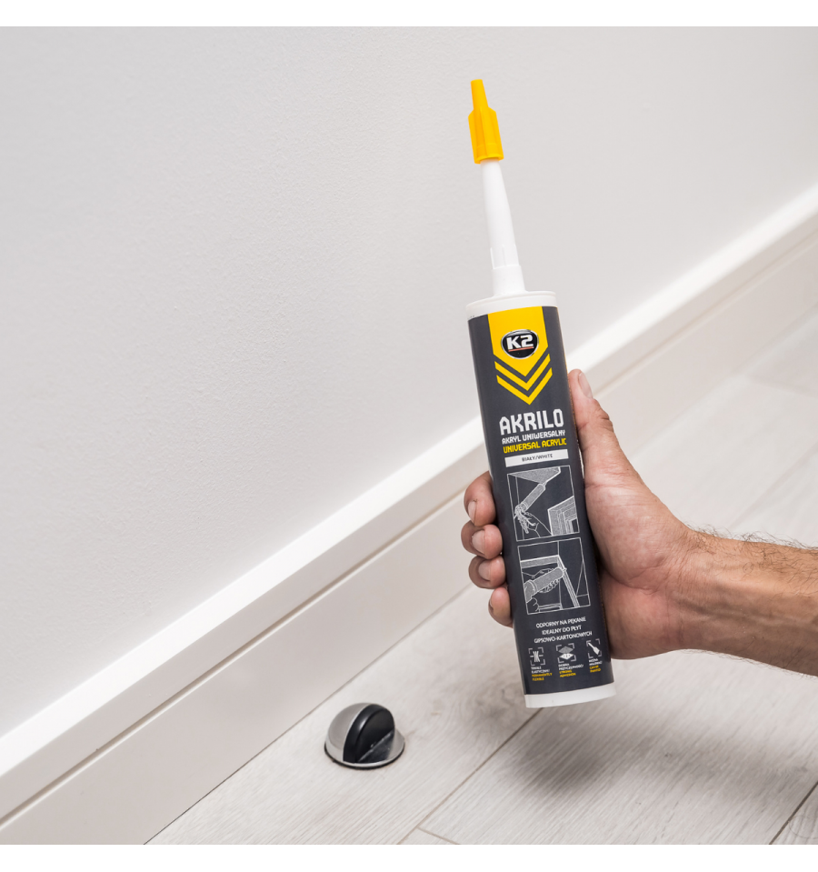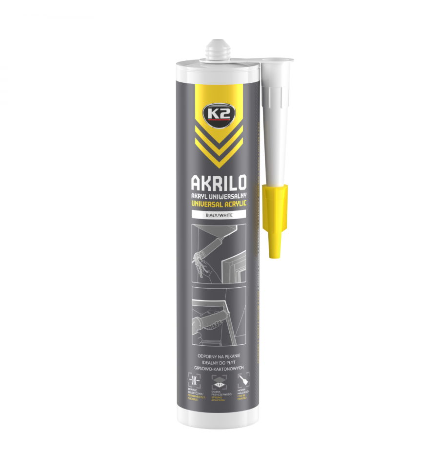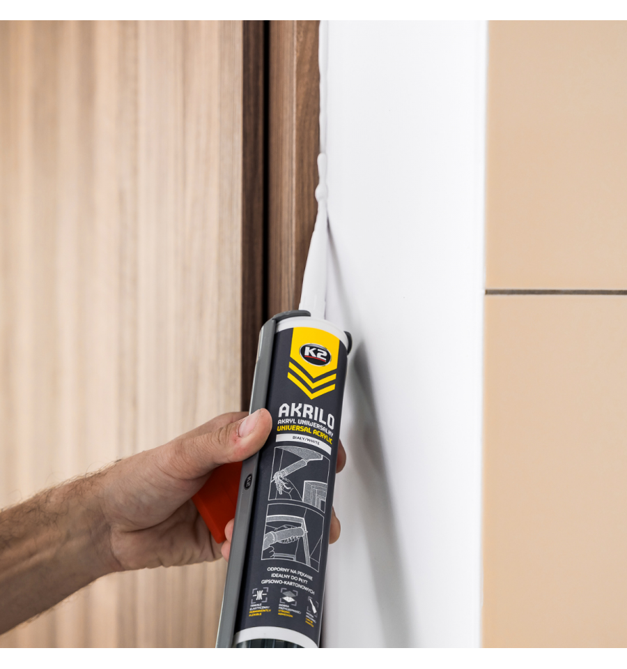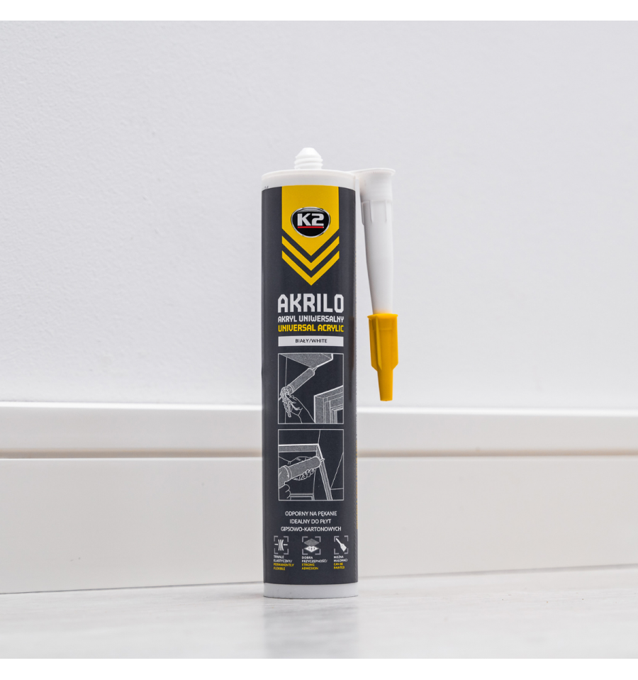 Akryl uniwersalny K2 AKRILO to jednoskładnikowy uszczelniacz przeznaczony do prac wykończeniowych i remontowych. Doskonale nadaje się do wypełniania pęknięć, rys i połączeń w podłożach takich jak tynk, gips, beton, cegła, płyty g-k, drewno oraz MDF.
