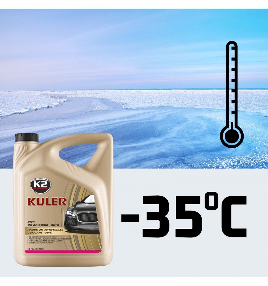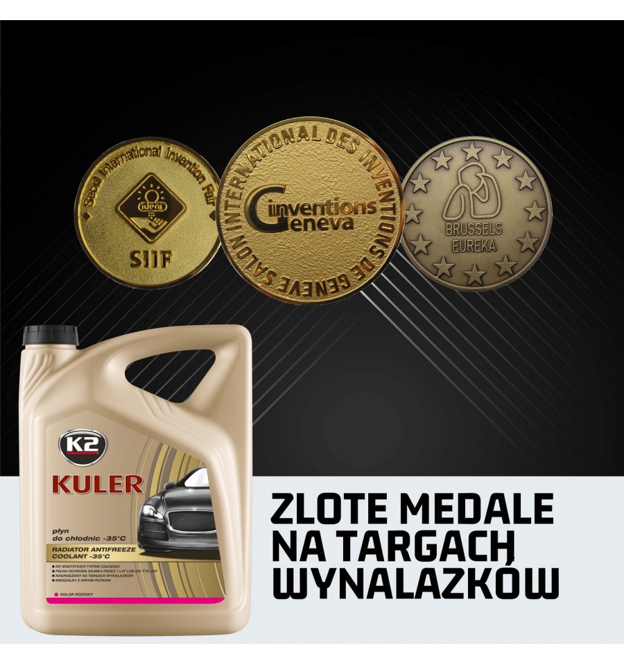 K2 KULER -35°C to nowoczesny, a zarazem uniwersalny, gotowy do użycia płyn chłodniczy, cechujący się bardzo wysokimi parametrami użytkowymi nagrodzony złotymi medalami na Międzynarodowych Targach Wynalazków w Brukseli, Genewie i Seulu.