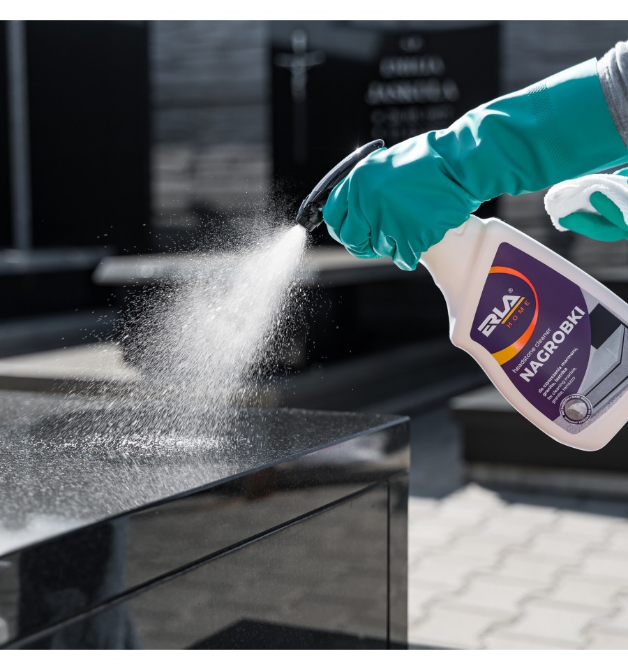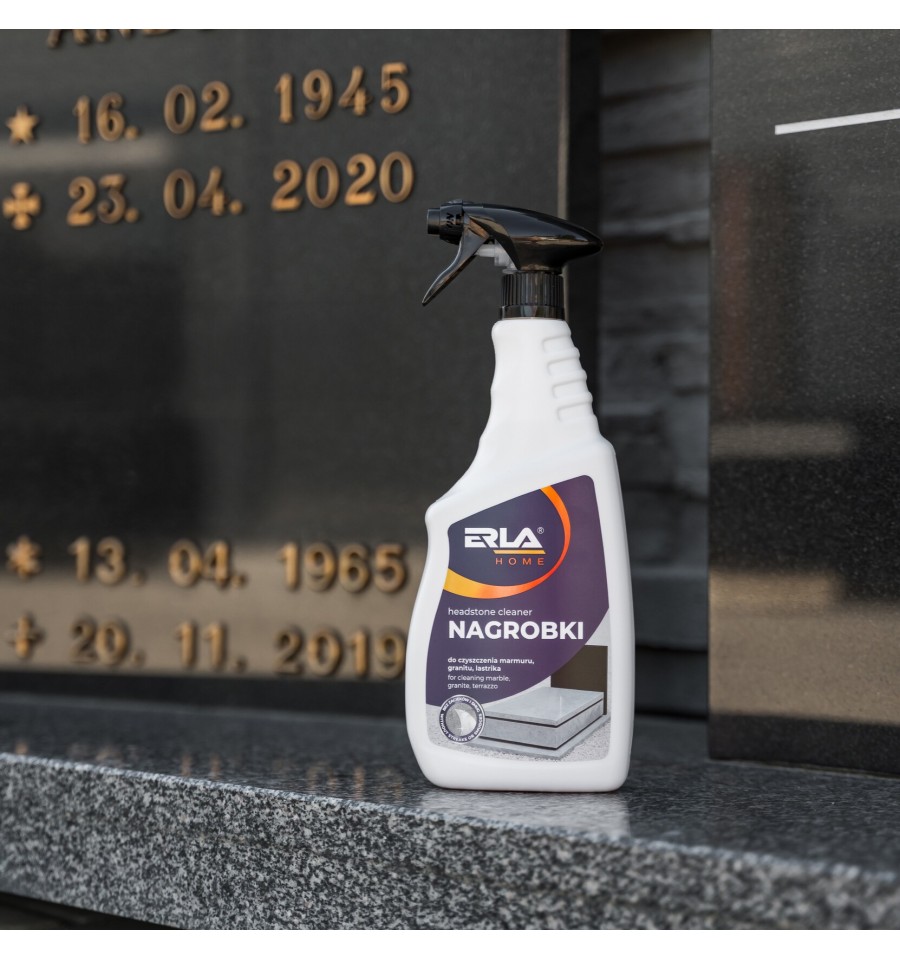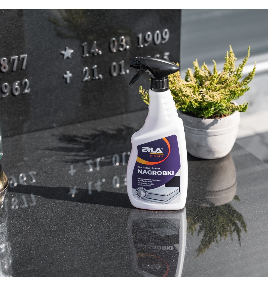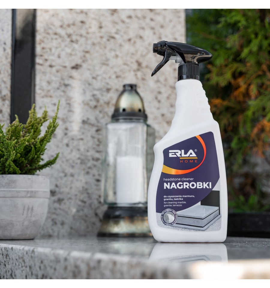 ERLA Nagrobki to silny i skuteczny preparat przeznaczony do czyszczenia nagrobków z lastryko, marmuru, granitu oraz betonu. Usuwa ślady po liściach, zielone naloty oraz inne naturalne osady, nie powodując przebarwień ani zarysowań.