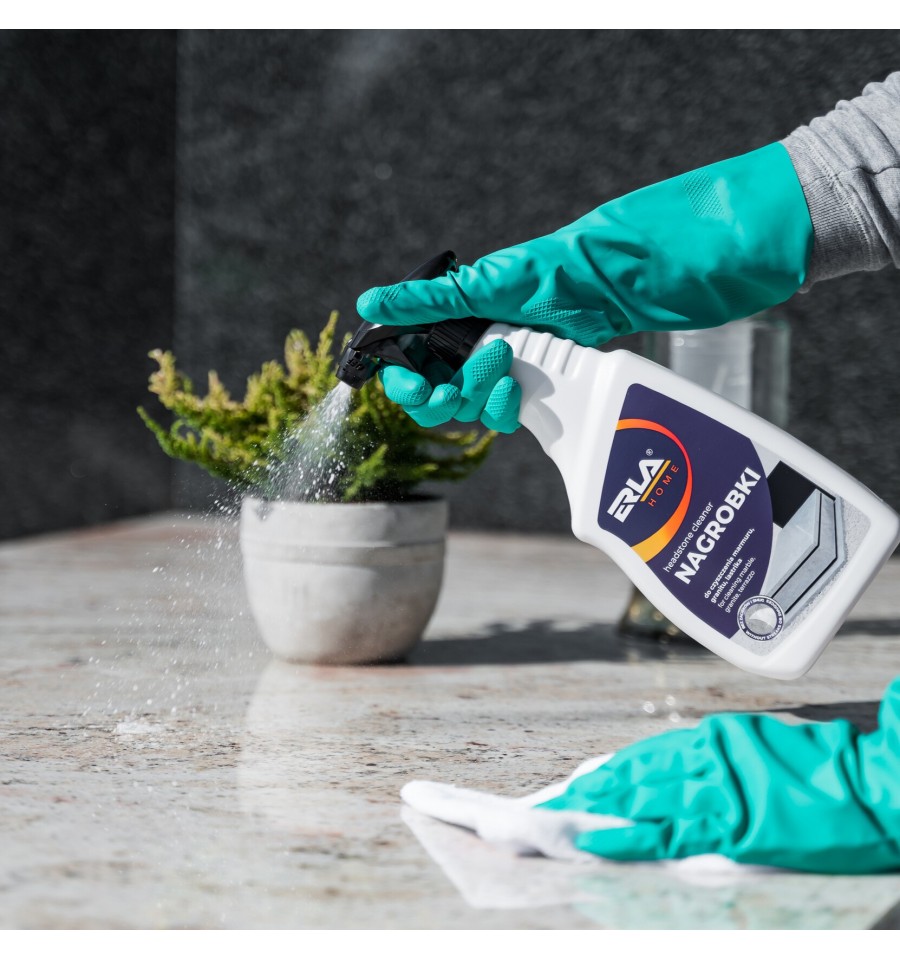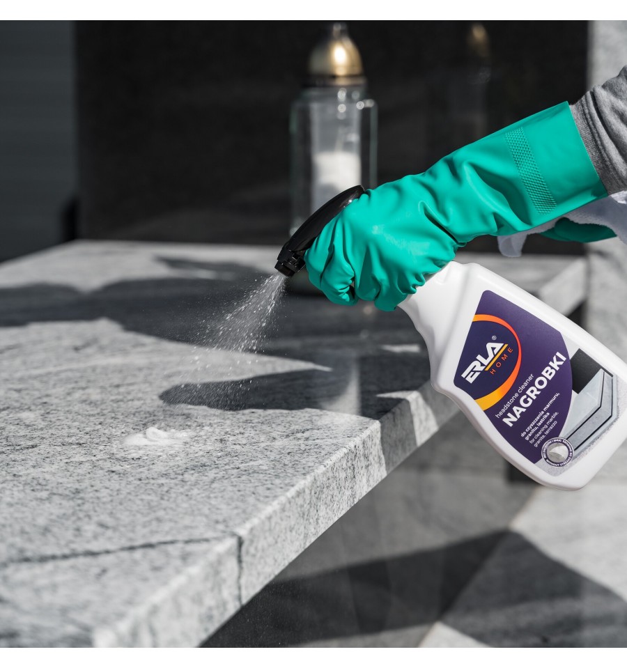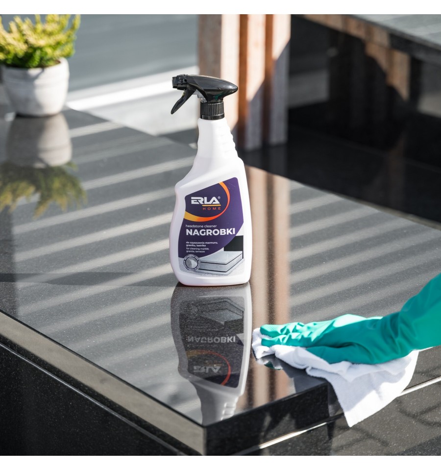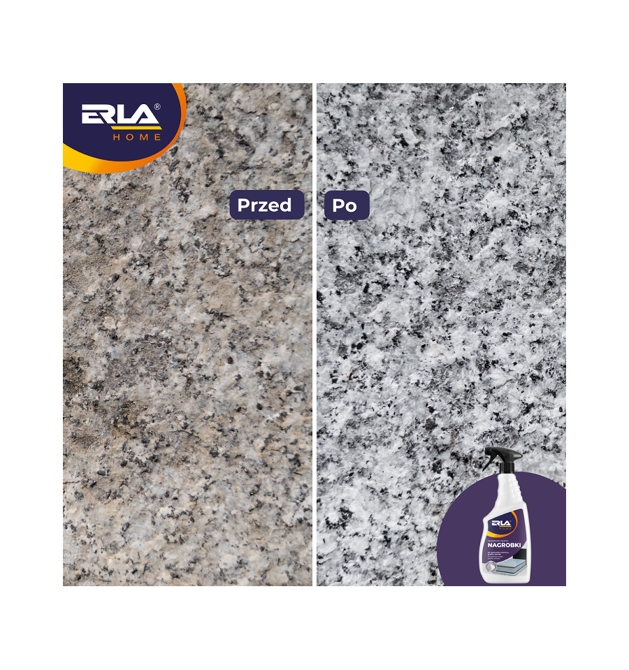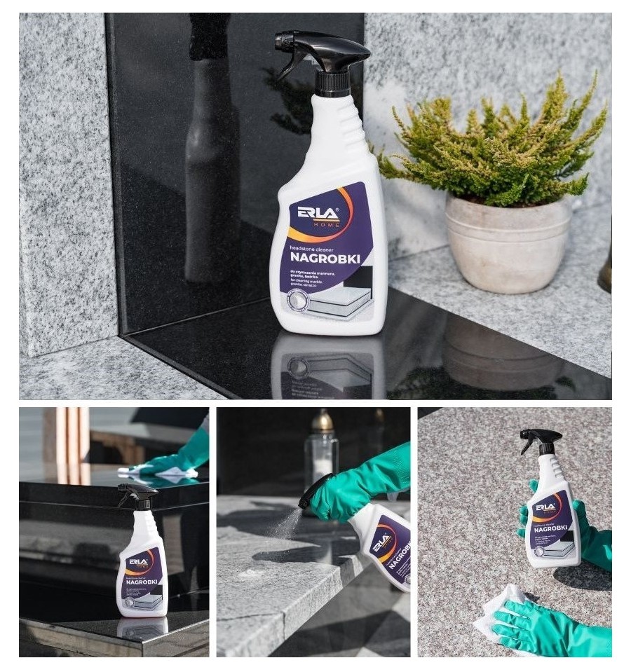 ERLA Nagrobki to silny i skuteczny preparat przeznaczony do czyszczenia nagrobków z lastryko, marmuru, granitu oraz betonu. Usuwa ślady po liściach, zielone naloty oraz inne naturalne osady, nie powodując przebarwień ani zarysowań.