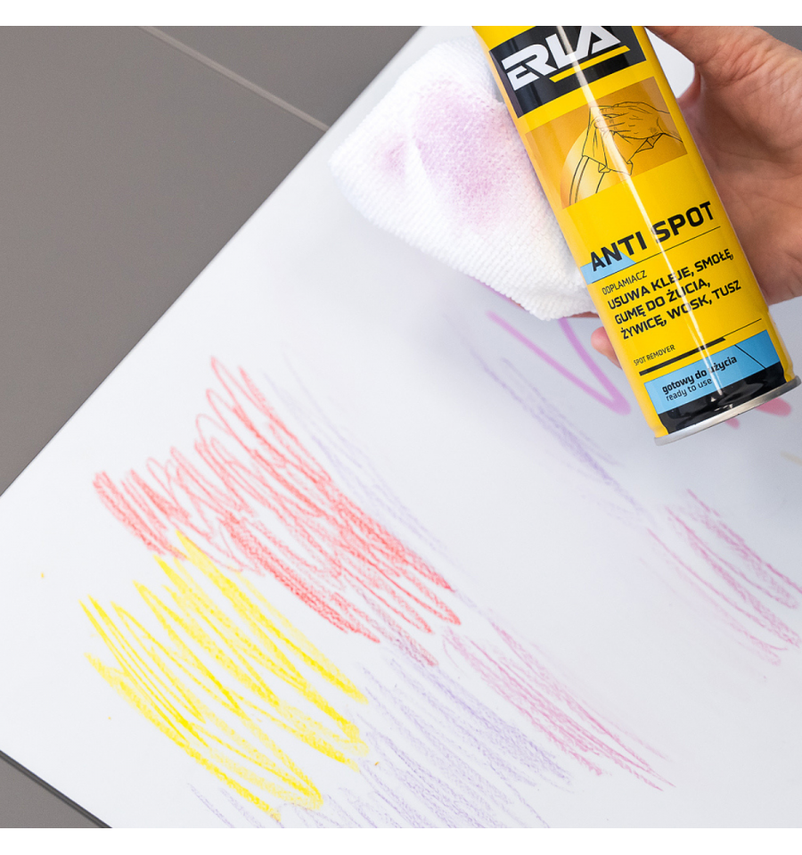 Aby zmyć marker permanentny, zastosuj ERLA Anti Spot, który skutecznie rozpuszcza trwały tusz. Wystarczy spryskać zabrudzenie, delikatnie przetrzeć i marker znika bez pozostawiania śladów.