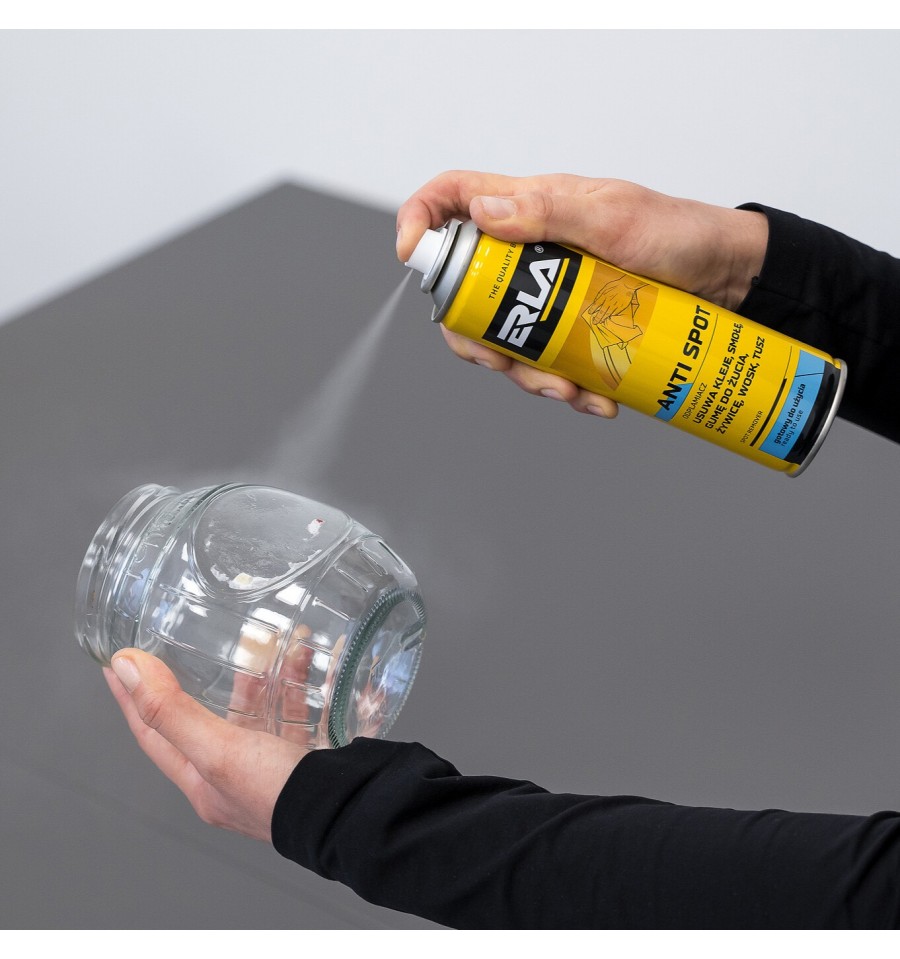 Aby usunąć klej po etykiecie ze słoika, wystarczy spryskać zabrudzone miejsce środkiem ERLA Anti Spot. Po kilku minutach klej odspaja się od szkła i można go łatwo zetrzeć, pozostawiając powierzchnię idealnie czystą.